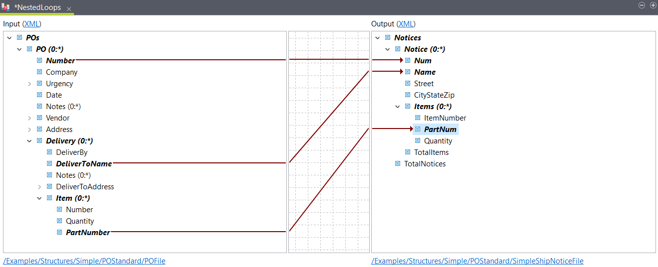 この例では、各Itemsループにある出力PartNumエレメントの数を返すよう出力TotalItemsエレメントを、出力Numエレメントの数を返すよう出力TotalNoticesエレメントをそれぞれ設定したいとします。