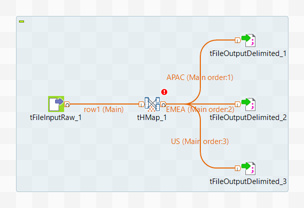 接続を使い、tFileInputRawコンポーネントをtHMapに、tHMapをtFileOutputDelimitedにそれぞれリンクさせます。