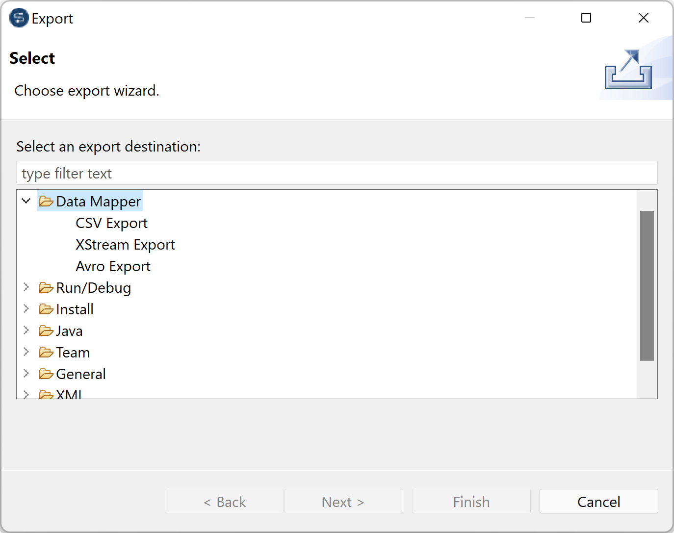 Talend Data Mapperでは、ストラクチャーをCSVファイルかAvroファイルとしてエクスポートしたり、エクスポートされたファイルを外部ツールで作業したりできます。