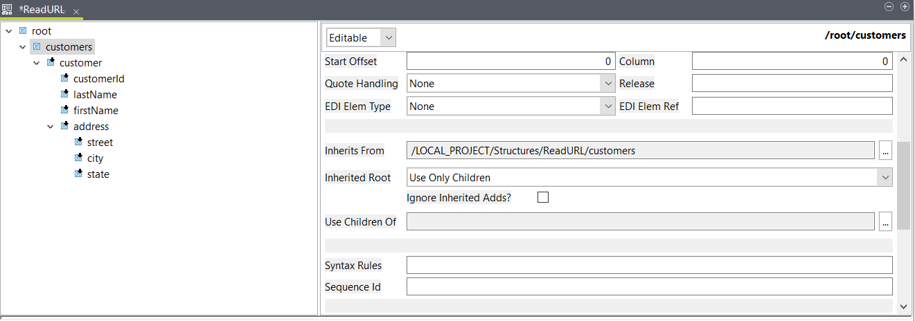 3. このcustomersエレメントで、[Inherits From] (継承元)の右にある[...]ボタンをクリックし、該当するストラクチャーを選択します。