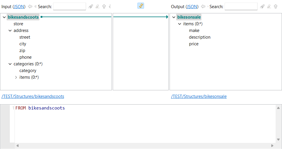 ルートエレメント間に最初のマッピングが自動的に作成されます。出力ストラクチャーのルートエレメントに、対応するData Shaping Query Languageの式が表示されます。