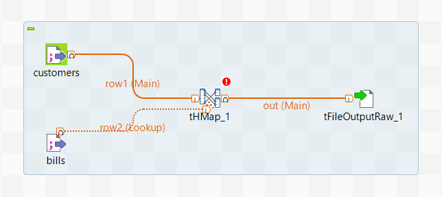 この例では、customersという名前のtFileInputDelimitedコンポーネントにidnamecityという名前が付いた3つのカラムを持つスキーマがあり、billsという名前のコンポーネントにcustomerIdbillIdpriceという名前が付いた3つのカラムがあります。