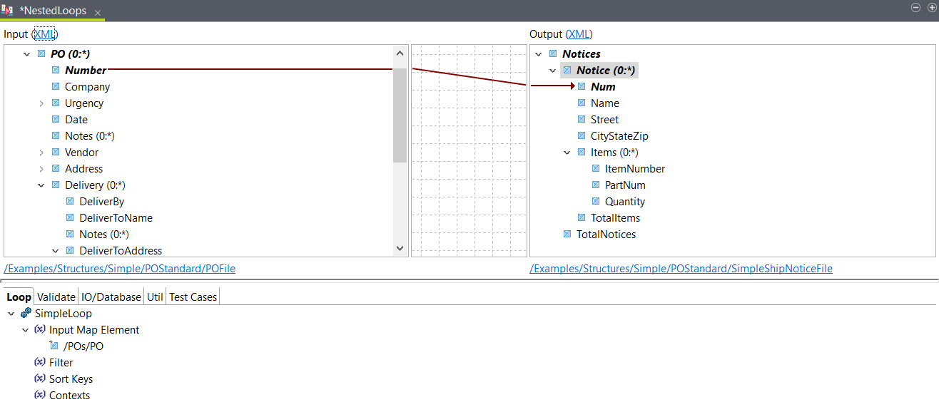 この例では、入力ルーピングエレメントの3つのレベルが出力の2つのレベルにマッピングされています。出力Noticeエレメントは入力Deliveryループにルーピングしなければなりませんが、親POループからのNumberエレメントを使用することも必要です。