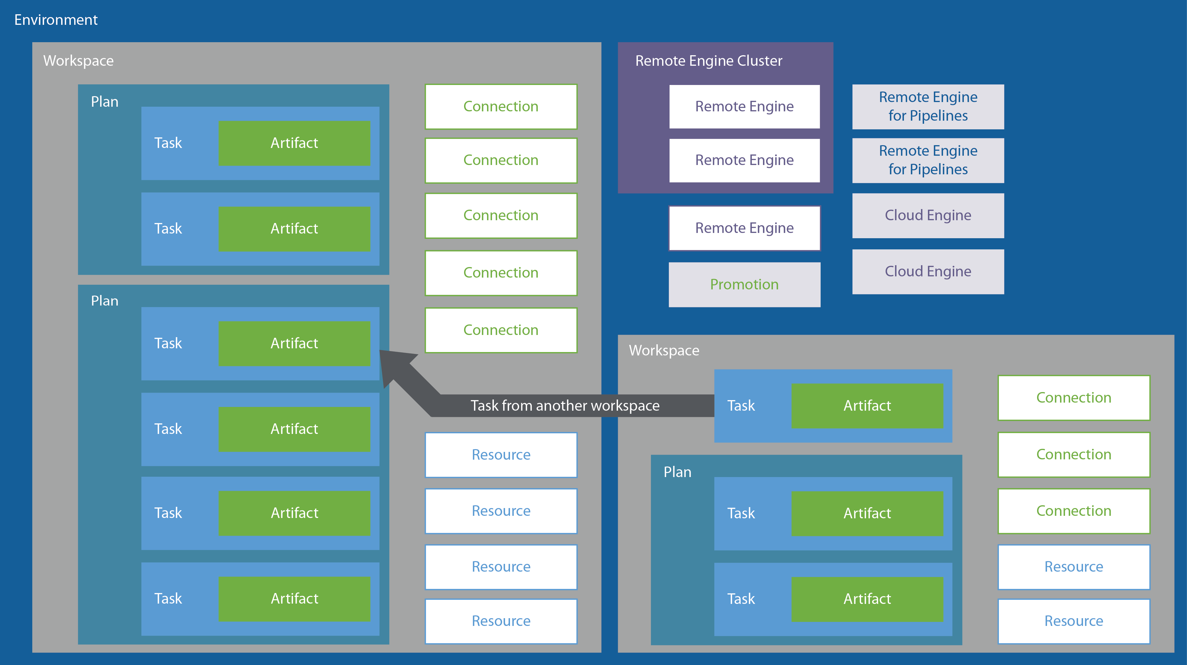 | タスク | スペースで作成され、特定の実行設定を持つアーティファクトのことです。たとえば、RemoteEngine-1で実行中のConnection-1を使ったArtifact-1などです。適切に命名されたコンテキスト変数は、タスクの設定中に適切な接続またはリソースを指定する必要があることを示します。 |