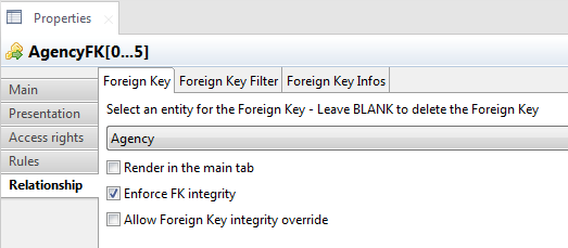 [Enforce FK integrity] (FK整合性の強制): 外部キーの整合性検証を有効にする場合。このチェックが有効な場合、この外部キーで他のレコードにリンクされているレコードを削除しようとすると、エラーが表示されます。