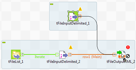 [Row] (行)> [Main] (メイン)接続を使って2つの入力コンポーネントを接続することはできません。受信可能な[Row] (行)接続は1つのコンポーネントにつき1つのみです。メイン[Row] (行)接続を使って同じターゲットコンポーネントを2回リンクすることはできません。2番目の[Row] (行)接続は[Lookup] (ルックアップ)と呼ばれます。