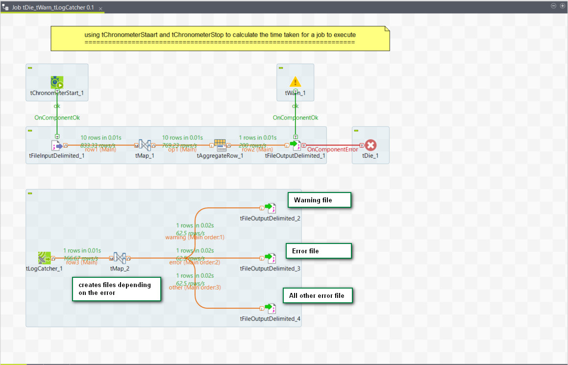 tLogCatcherはすべてのエラーをキャッチし、tMapで与えられた条件に従ってリダイレクトします。ここでは、tWarnで発生した警告はすべて警告ファイルに、tDieで発生したエラーメッセージはすべてエラーファイルに、予期しないその他のエラーはすべて別のエラーファイルにそれぞれ送信されます。