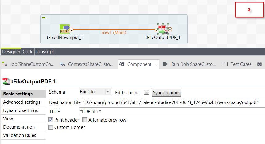 - [Palette] (パレット)からデザインワークスペースに、tFixedFlowInputとカスタムコンポーネントであるtFileOutputPDFを配置します。