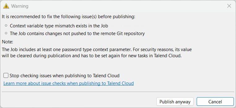 [Preferences] (環境設定) > Talend Cloudビューへの公開時に[Stop checking issues when publishing to Talend Cloud] (Talend Cloudへの公開時の問題チェックを停止)チェックボックスがクリアされると、次のいずれかのケースで、Talend Cloudへの公開時にダイアログボックスで警告メッセージが表示されます:
