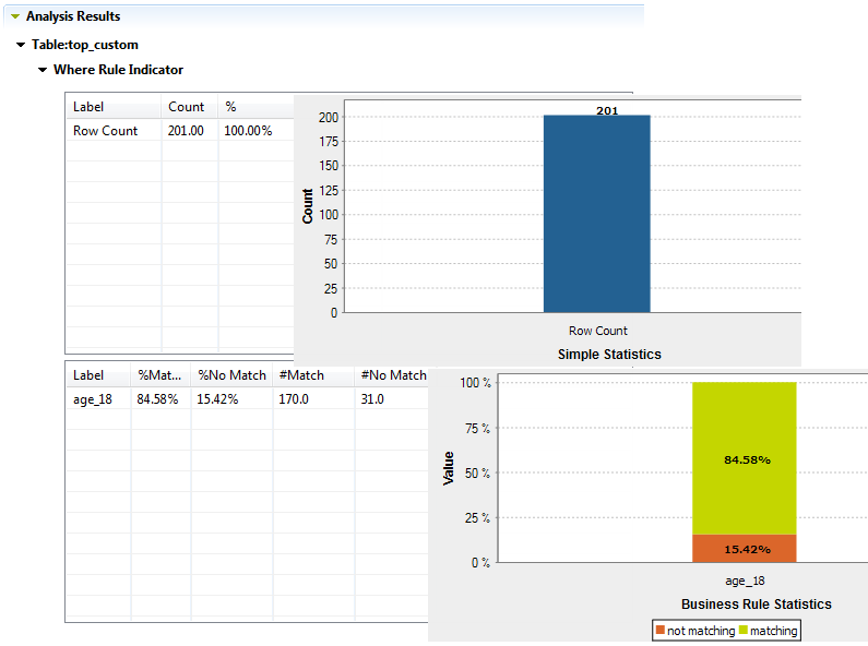 WHERE句を使用したビジネスルールがインジケーターとして追加されているテーブル分析の結果に対して既製ジョブを生成できます。このジョブは有効または無効な行を再取得し、それらを出力ファイルまたはデータベースに書き込みます。