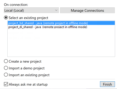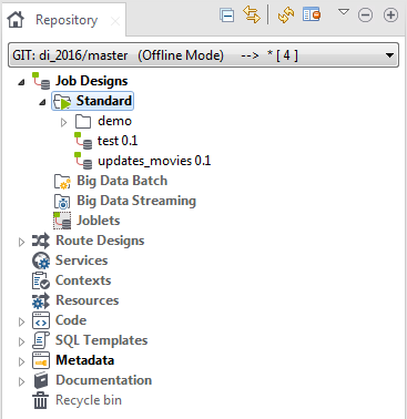 Talend Studioでは、オフライン(ローカル)モードでリモートプロジェクトを開くことができます。オフラインモードでは、他のユーザーと並行して項目を編集したり、リモートプロジェクトに再びログオンして自分の変更をGitにコミットしたり、編集された項目が他のユーザーによってロックされていたり競合状態にある場合に自分の変更をローカルに保存したりできます。
