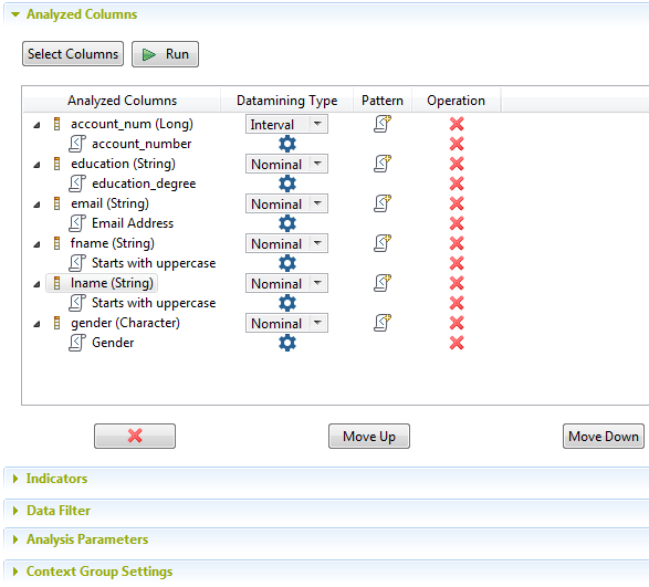 追加された正規表現は[Analyzed Columns] (分析済みカラム)ビューの分析カラムの下に表示され、[All Match] (すべてマッチ)インジケーターは[Indicators] (インジケーター)ビューの[Indicators] (インジケーター)リストに表示されます。
