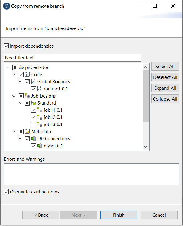 Talend Studioでは、リモートブランチまたはタグから現在作業しているブランチに項目を1つ以上コピーできます。