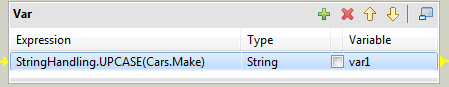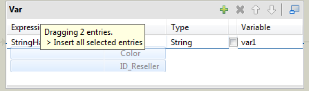 | 選択したすべての入力エントリーを1つの既存のVarエントリーに連結します。 | 強調表示されているVarエントリー上にドラッグ&ドロップします。すべてのエントリーが1つのセルに連結されます。Javaの演算記号を使って必要な演算子を追加します。ドットで文字列変数を連結します。 |