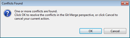 複数のユーザーが同じプロジェクトで同時に作業している共同環境では、ブランチをプッシュ、アップデート、マージする時に、競合が発生する場合があります。この場合、競合を解決するかどうかを尋ねるダイアログボックスが表示されます。