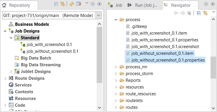 [Do not create or update screenshots for Jobs, Joblets, Routes and Routelets] (ジョブ、ジョブレット、ルート、ルートレットのスクリーンショットを作成またはアップデートしない)チェックボックスが選択されている場合は、ジョブ、ジョブレット、ルート、ルートレットの作成時に、[Navigator] (ナビゲーター)ビューで.screenshotファイルが生成されていないこと、およびジョブ、ジョブレット、ルート、ルートレットのアップデート時に、既存の.screenshotファイルがアップデートされていないことが後でわかります。