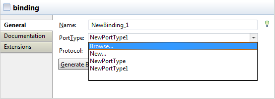 [PortType] (ポートタイプ)フィールドをクリックして、バインドのポートタイプを設定します。現在のファイルのポートタイプが含まれるリストから、必要なポートタイプを選択できます。また、[New...] (新規...)を選択して[New PortType] (新規ポートタイプ)ウィザードを開いて新しいポートタイプを作成したり、[Browse...] (参照...)を選択して[Specify Port Type] (ポートタイプの指定)ウィザードを開いたりすることもできます。詳細は、ポートタイプを設定をご覧ください。