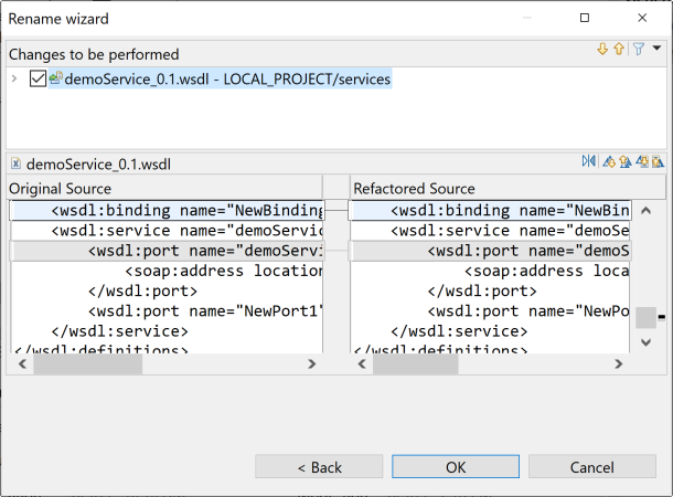 [New name] (新しい名前)フィールドに新しい名前を入力します。[Update references] (参照のアップデート)チェックボックスをオンにして、それが含まれるWSDLファイルにこの変更をプロパゲートさせます。[Preview] (プレビュー)をクリックして、元のソースとリファクタリングされたソースを表示させます。