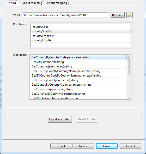 この例ではGetCountryByCountryCode(parameters):string を選択し、特定の国コードの国名を取得します。