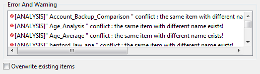 項目のインポートはその依存項目をすべて含めなければ実行できません。たとえば分析をインポートしようとした時に、デフォルトではこの分析で使用されるメタデータ接続、パターン、インジケーターなどすべての依存項目が選択され、分析と共にインポートされます。