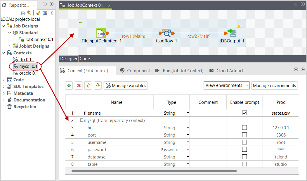 [Context] (コンテキスト)ビューには、ジョブまたはルートのコンテキスト環境と変数がすべて表示されます。次の操作が可能です。