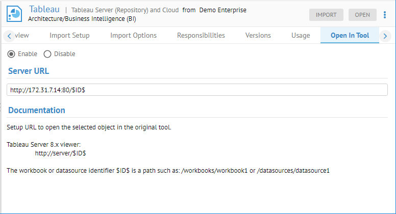 モデルのインポート時に[Open In Tool] (ツールで開く)オプションを有効にした場合、元のツールからモデル内のオブジェクトを開くことができます。このオプションは一部のインポートブリッジ(Tableauなど)でのみ利用可能です。