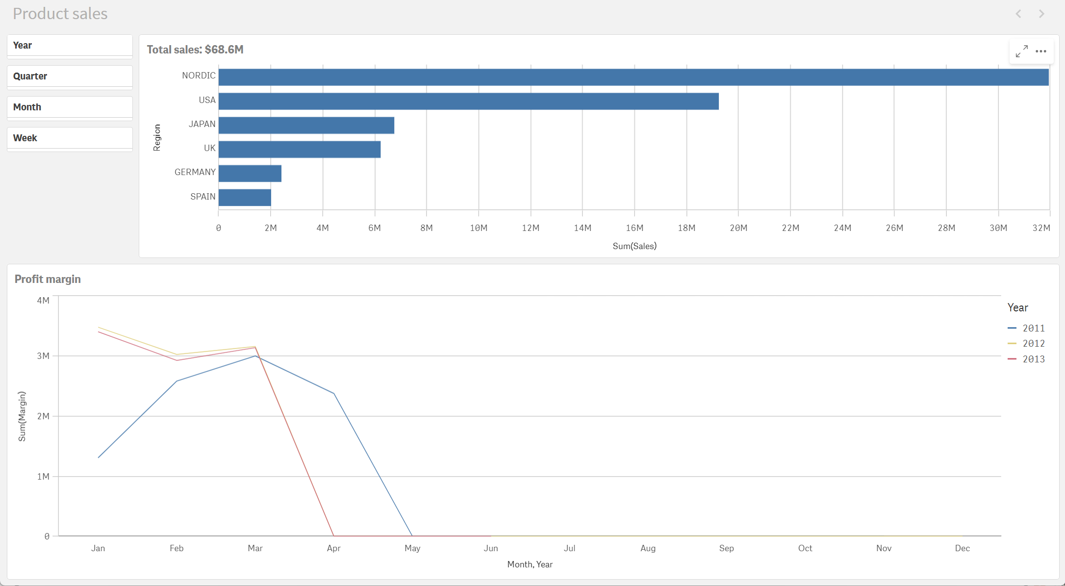 - 关闭筛选器窗格。Profit margin 图表示出每年前三个月的数据。