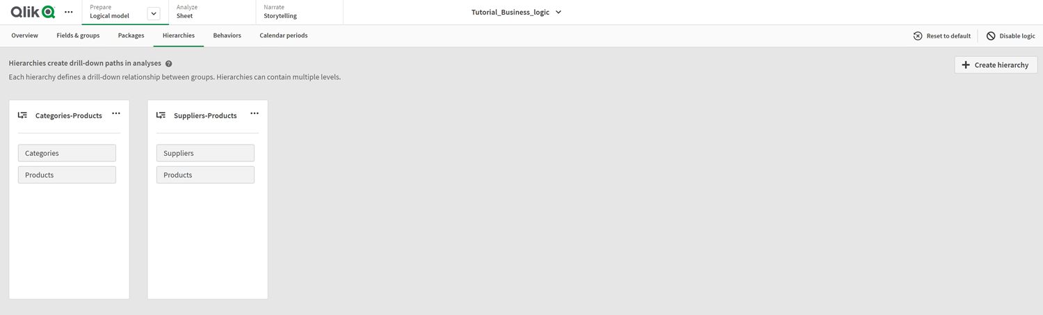 当您启用商业逻辑时,某些层级可能会由 Qlik Sense 从您的数据模型自动创建。如果导航到层级,可以看到商业逻辑创建了两个层级。