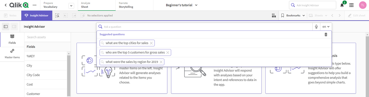 您可以將範例問題新增至 Insight Advisor。這些有助於向應用程式使用者提供範例問題,以協助引導或鼓勵分析。