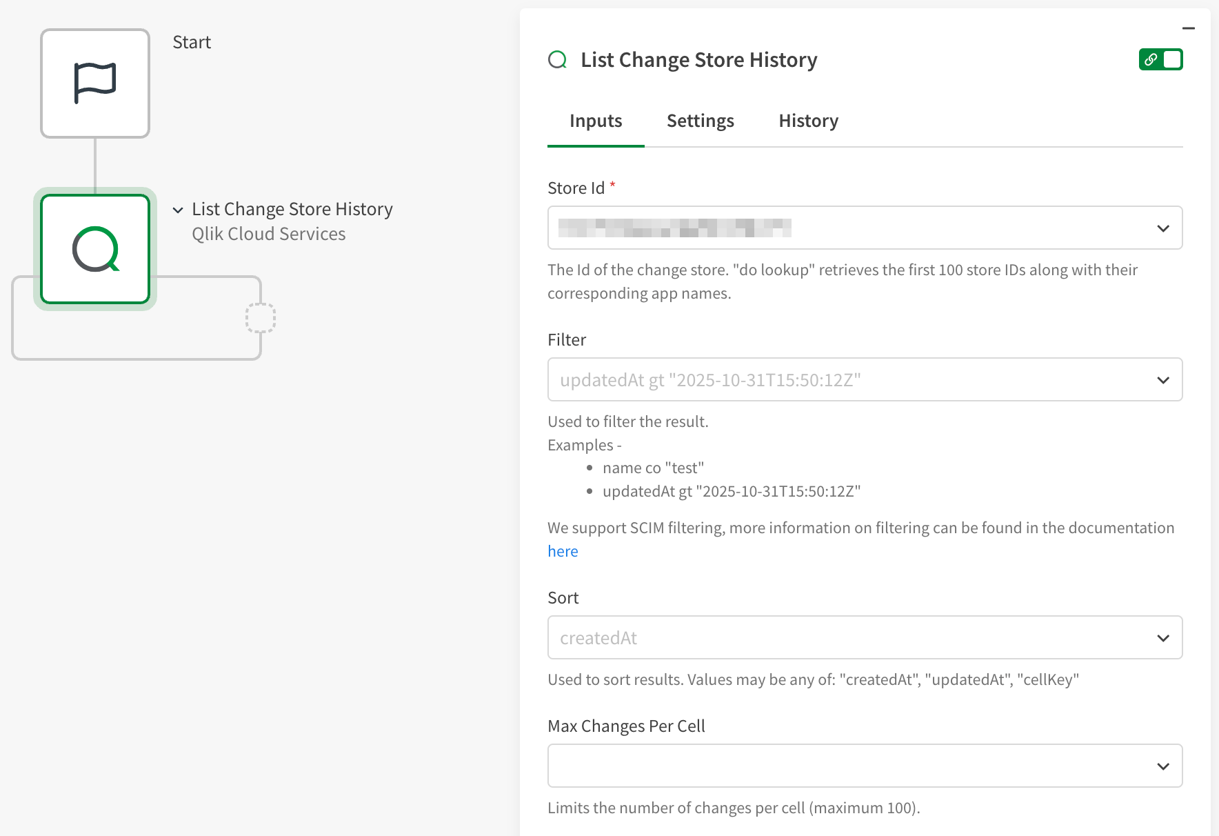 List Change Store History區塊使用 API 端點/changes,並傳回每個儲存格的完整歷史記錄。如果儲存格已更新多次,則此區塊將傳回每個值、userId以及updatedAt時間戳記,針對每次更新。